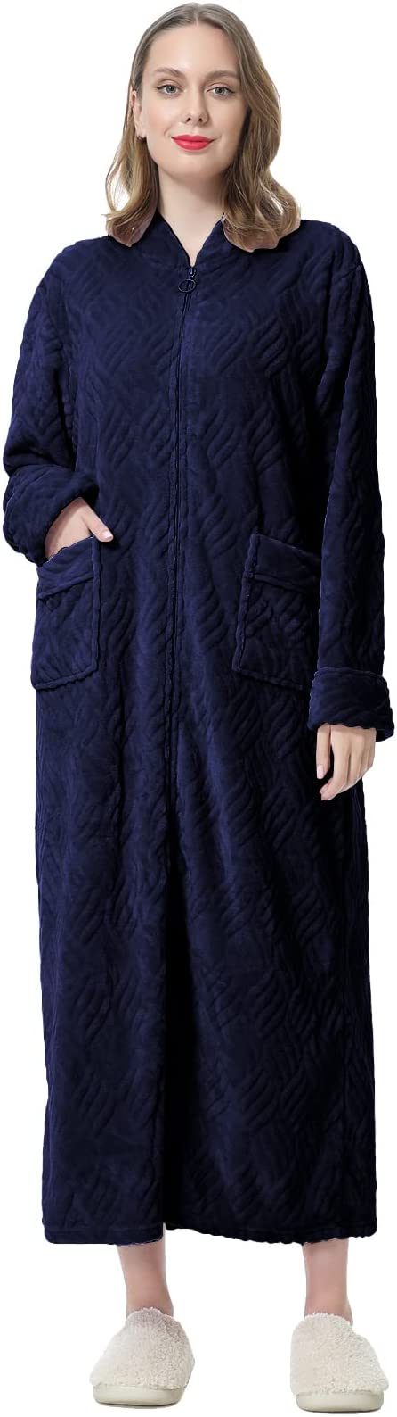 Long Hooded Zipper Bathrobe for Womens Flannel Fleece Robes Winter Warm Housecoat Nightgown Sleepwear Pajamas